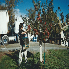 まず、ハシゴを使って2~3メートルの高さにあるリンゴを収穫しました。しかし、山の斜面なのでハシゴが安定せず(涙)。バッグにリンゴを入れると約15kgの重さになり、そのリンゴを大きなコンテナ(1.5立方メートル)に詰めます。出来高制で1コンテナいくらという感じですが、リンゴが傷つくと単価が下がり、丁寧にやるとコンテナ数が稼げずあまり儲かりません(涙)。なので、開き直ってそこらのリンゴをつまみ食いしていました(汗)。